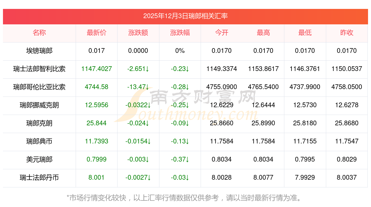 2025年12月3日瑞郎相關(guān)匯率查詢