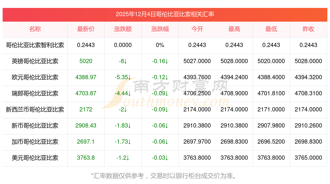 2025年12月4日哥倫比亞比索相關(guān)匯率查詢