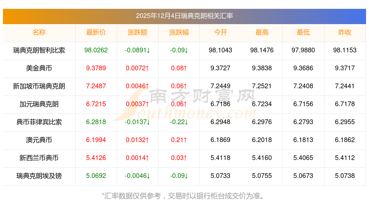 根據(jù)2025年12月4日匯率,瑞典克朗兌換巴西雷亞爾匯率最新價0.565900,今開價0.5664,昨收價0.5664,最高價0.5666,最低價0.5657。