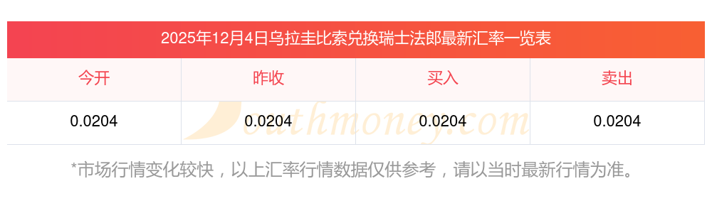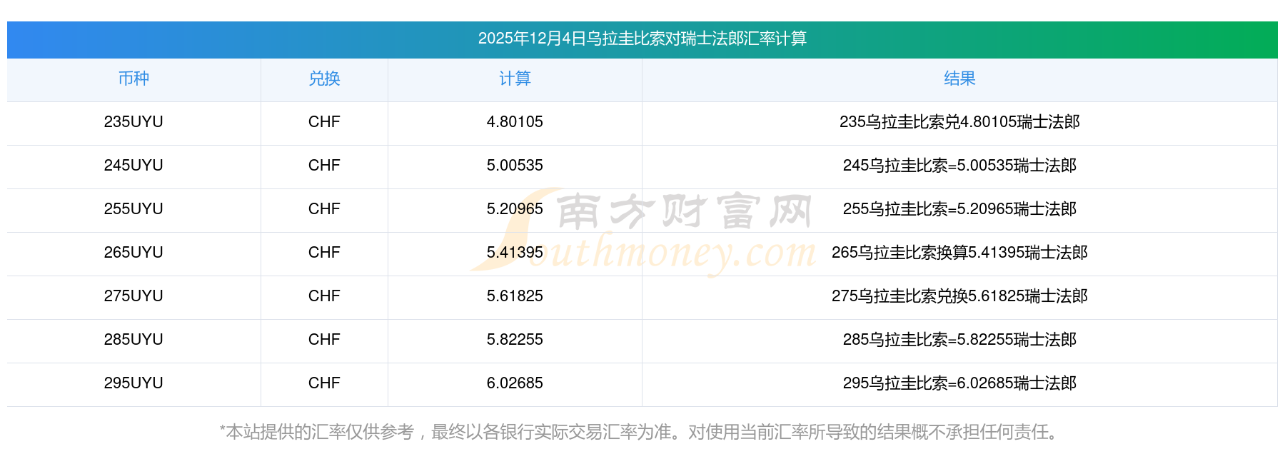 今日烏拉圭比索匯價(jià):2025年12月4日32烏拉圭比索兌瑞士法郎匯價(jià)一覽表