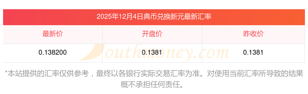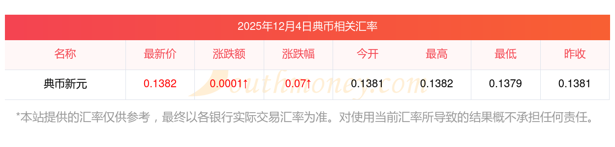 2025年12月4日典幣兌換新元匯率是:0.1382