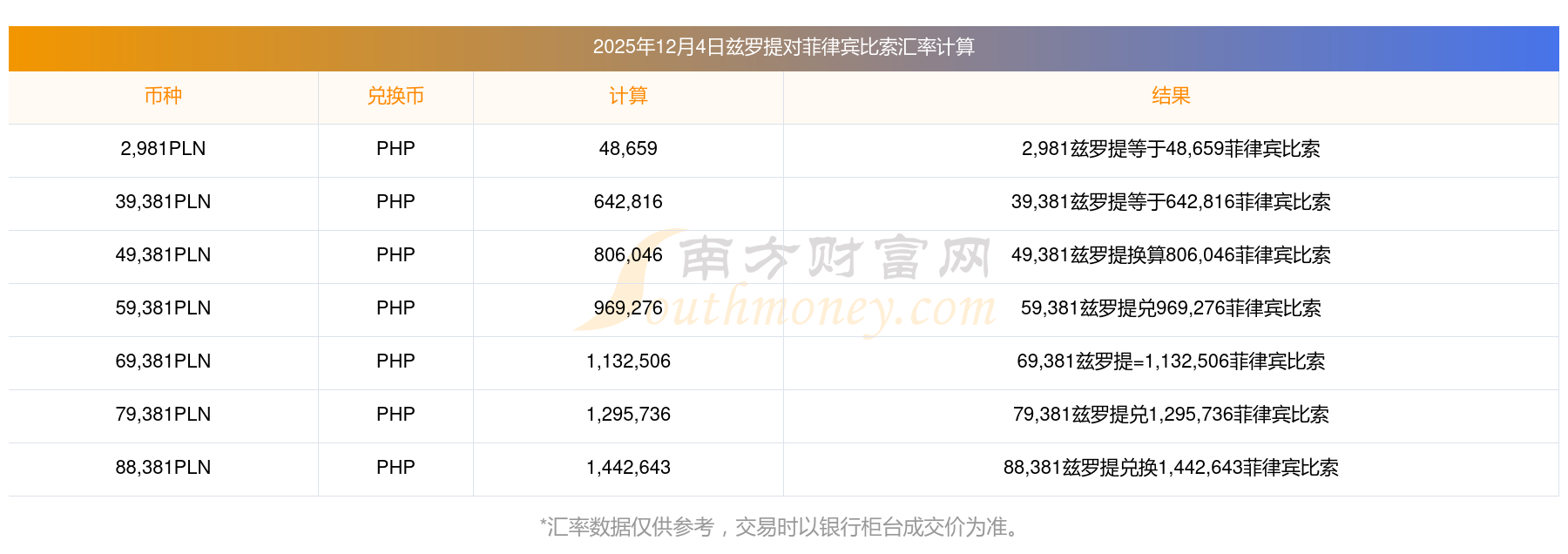 2025年12月4日茲羅提與菲律賓比索的兌換匯率計(jì)算如下: