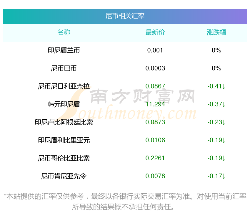 南方財富網(wǎng)為您提供尼幣對尼日利亞奈拉匯率最新價格詳情。