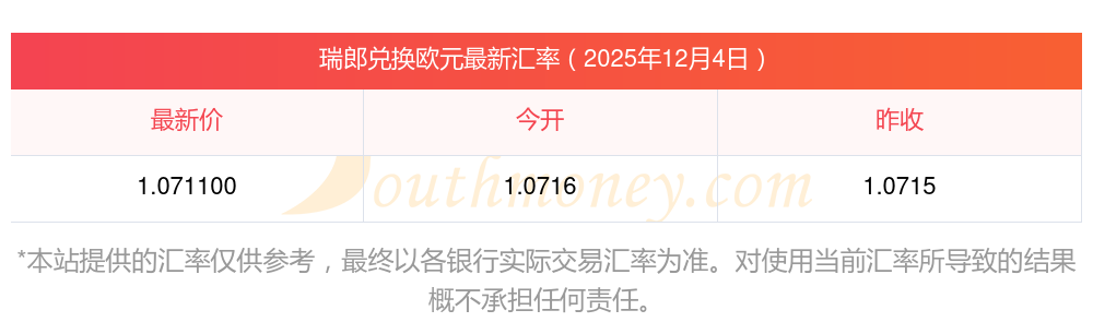 2025年12月4日貨幣兌換:10瑞郎=1.0711歐元。舉例:假如一塊面包需要10瑞郎,則需歐元:1.0711歐元。