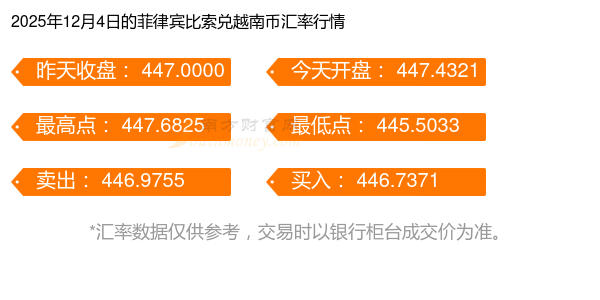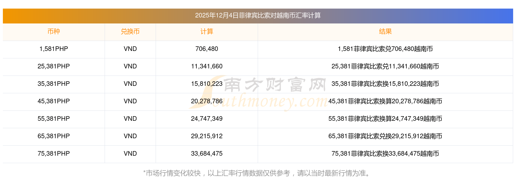 菲律賓比索今日匯價表:2025年12月4日5菲律賓比索兌越南幣匯價多少