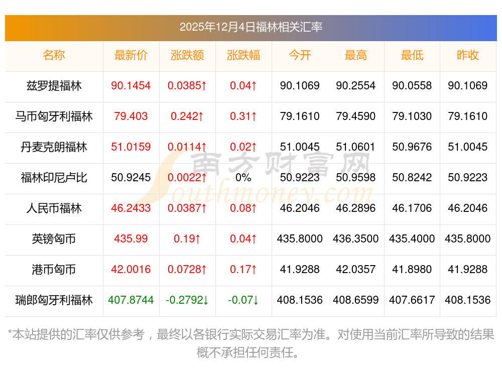2025年12月4日最新消息,福林兌換烏拉圭比索最新匯率為0.119900,今開為0.1200,昨收為0.1201,最高為0.1201,最低為0.1198。