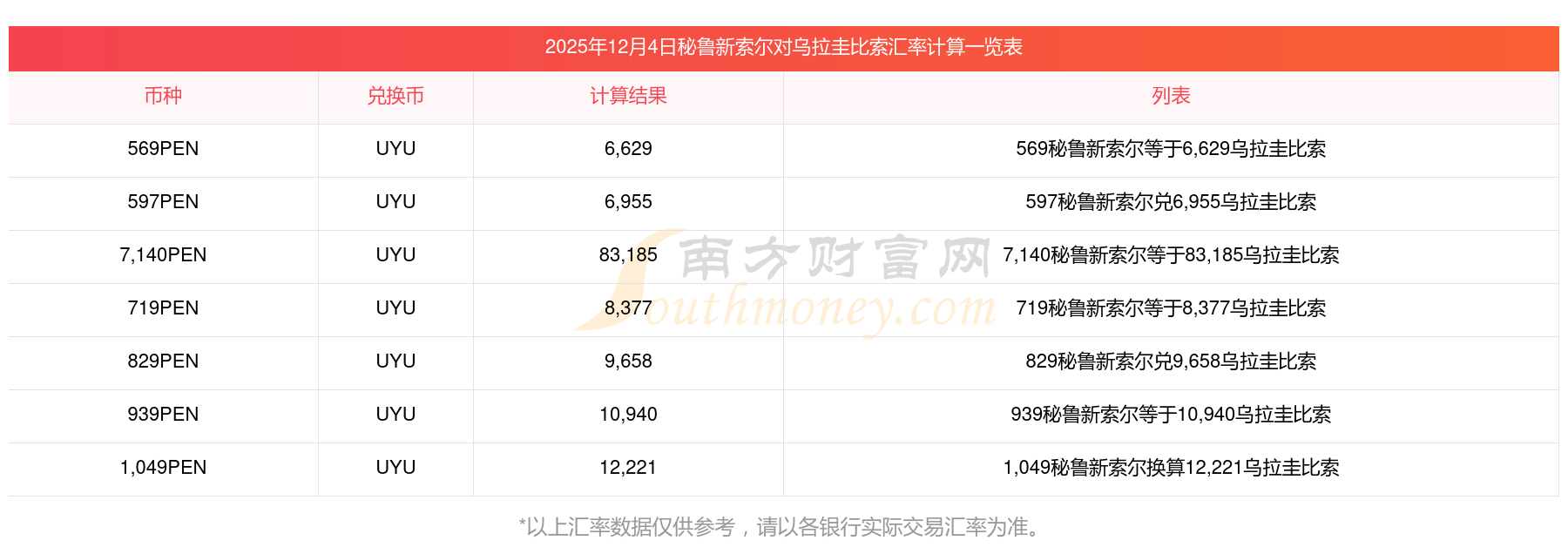 如:1秘魯新索爾、2秘魯新索爾、5秘魯新索爾、10秘魯新索爾、20秘魯新索爾、50秘魯新索爾、100秘魯新索爾,分別折合烏拉圭比索11.6506、23.3012、58.253、116.506、233.012、582.53、1165.06烏拉圭比索。舉例:假如一瓶礦泉水需要1秘魯新索爾,則需烏拉圭比索:11.6506烏拉圭比索。