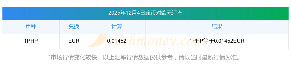 2025年12月4日菲幣兌換歐元匯率是:0.01452