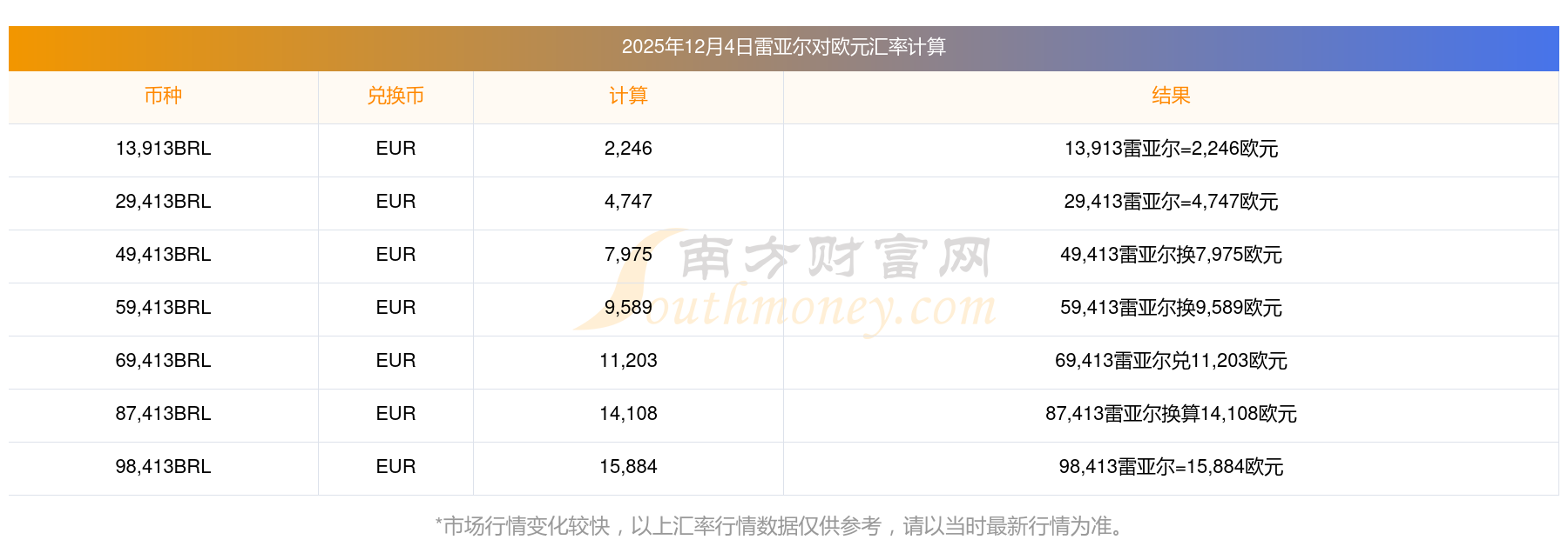 2025年12月4日雷亞爾對(duì)歐元的匯率為:0.1614