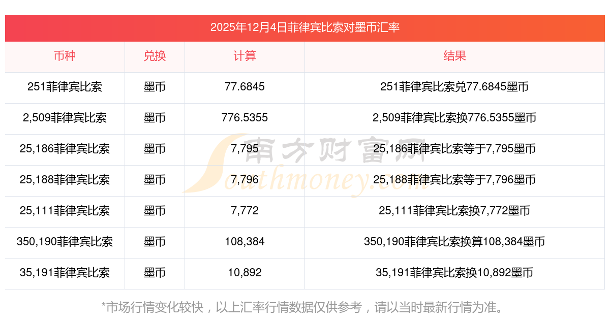 今天匯率更新!2025年12月4日86菲律賓比索兌換墨幣是多少?
