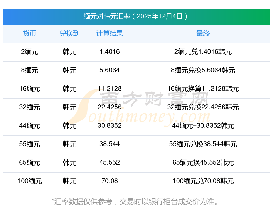 緬元的匯率:5緬元兌韓元匯率查詢2025年12月4日