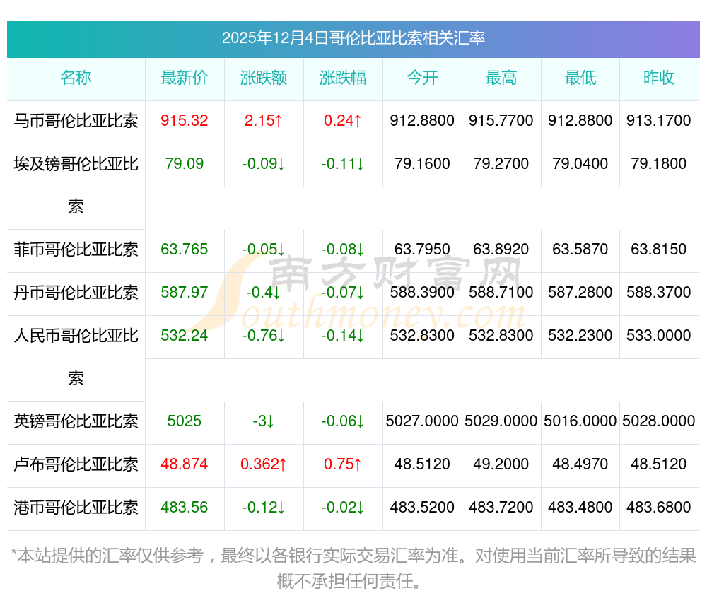 2025年12月4日哥倫比亞比索相關(guān)匯率查詢