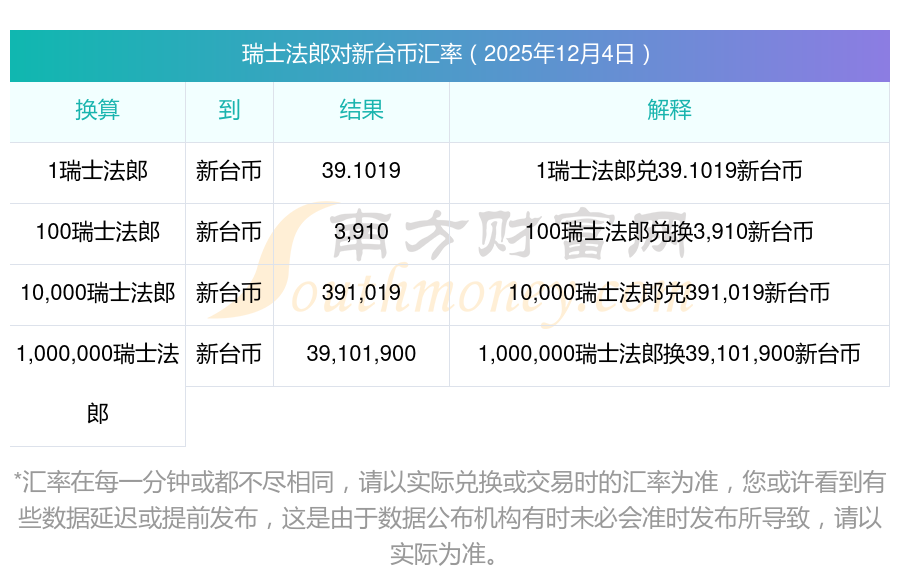 今日匯率表查詢 瑞士法郎兌新臺(tái)幣是多少2025年12月4日