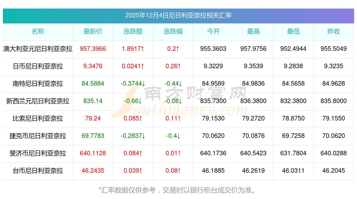 2025年12月4日尼日利亞奈拉相關(guān)匯率查詢
