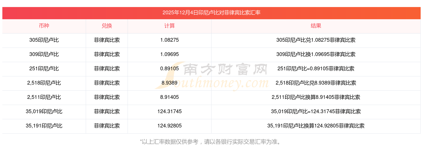 南方財(cái)富網(wǎng)為您提供印尼盧比對(duì)菲律賓比索匯率最新價(jià)格詳情。