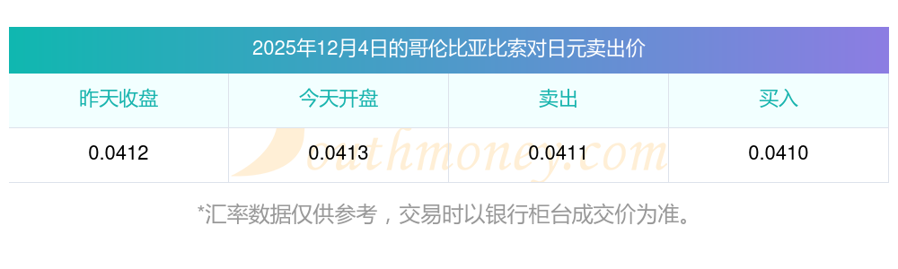 哥倫比亞比索今日匯率:哥倫比亞比索對日元匯率是多少?2025/12/04