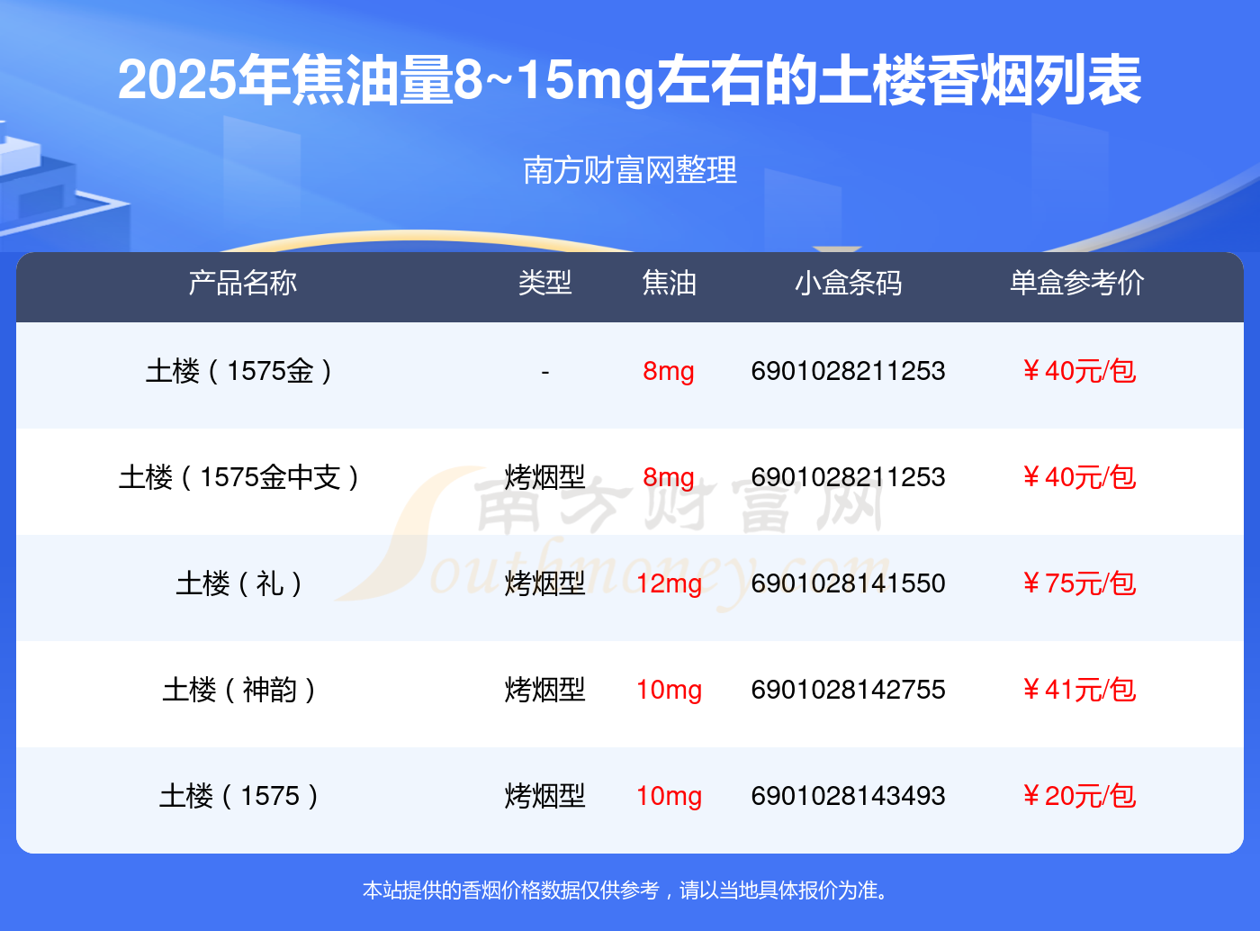 土樓香煙焦油量8~15mg左右的煙有土樓(1575金)、土樓(1575金中支)、土樓(禮)、土樓(神韻)、土樓(1575)等,詳細(xì)價格如下: