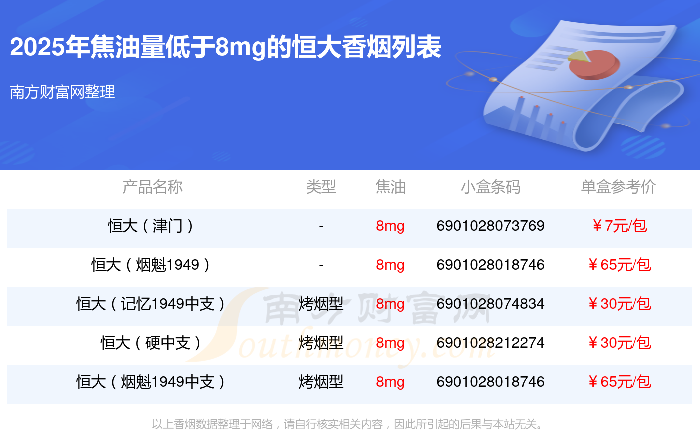 恒大香煙焦油量低于8mg的煙有哪些?擇煙網(wǎng)為大家整理提供,分別有:恒大(津門)、恒大(煙魁1949)、恒大(記憶1949中支)、恒大(硬中支)、恒大(煙魁1949中支)等,具體價格如下: