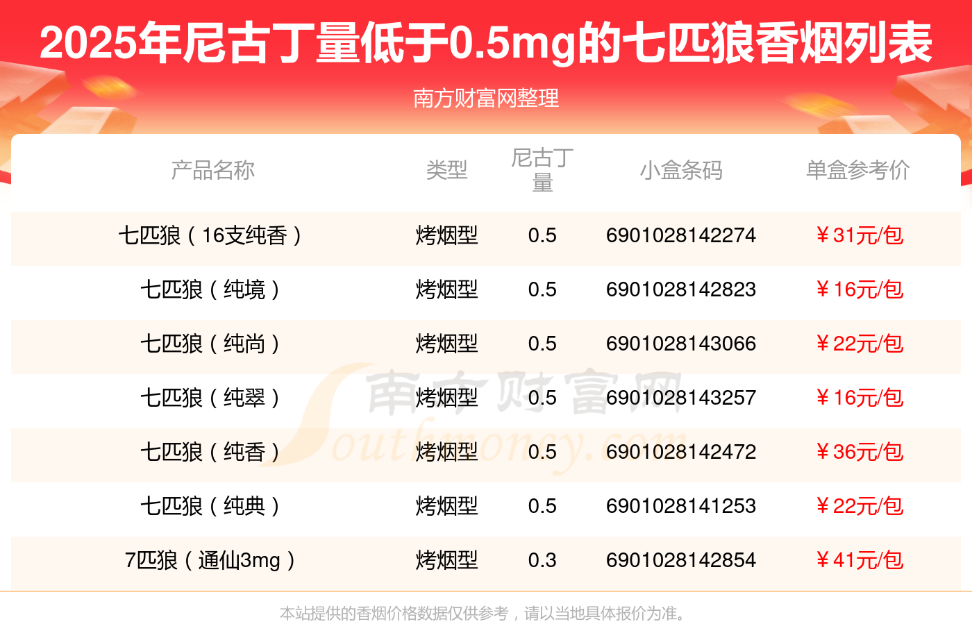 七匹狼(16支純香)參考價31.0元/包、七匹狼(純境)參考價16.0元/包、七匹狼(純尚)參考價22.0元/包、七匹狼(純翠)參考價16.0元/包、七匹狼(純香)參考價36.0元/包、七匹狼(純典)參考價22.0元/包、7匹狼(通仙3mg)參考價41.0元/包等。