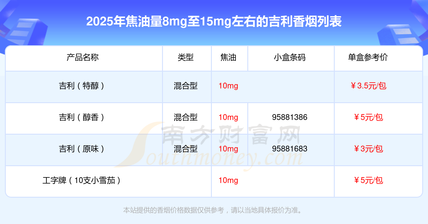 吉利香煙焦油量8mg至15mg左右的煙分別有吉利(特醇)參考價(jià)3.5元/包、吉利(醇香)參考價(jià)5元/包、吉利(原味)參考價(jià)3元/包、工字牌(10支小雪茄)參考價(jià)5元/包等。