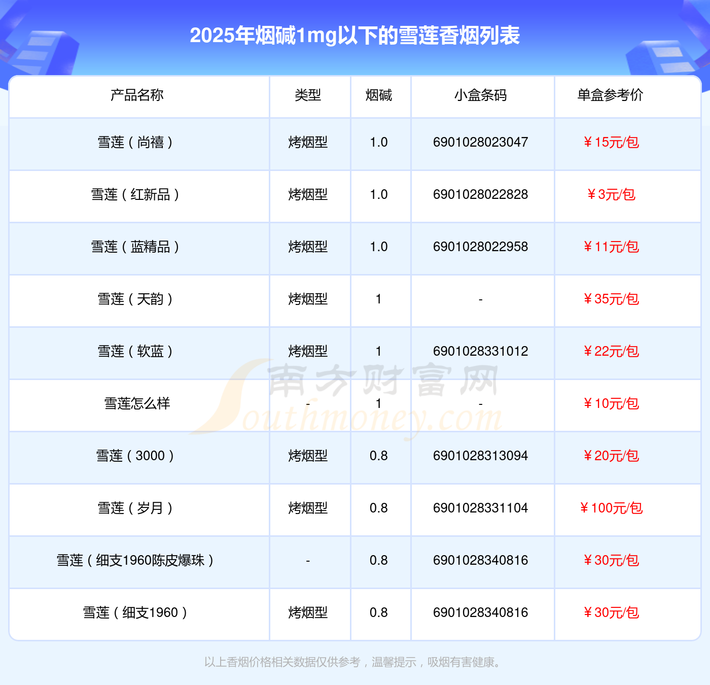 雪蓮香煙煙堿1mg以下的煙分別有雪蓮(尚禧)參考價15.0元/包、雪蓮(紅新品)參考價3.0元/包、雪蓮(藍精品)參考價11.0元/包、雪蓮(天韻)參考價35元/包、雪蓮(軟藍)參考價22元/包、雪蓮怎么樣參考價10元/包、雪蓮(3000)參考價20.0元/包、雪蓮(歲月)參考價100.0元/包、雪蓮(細支1960陳皮爆珠)參考價30元/包、雪蓮(細支1960)參考價30元/包等。