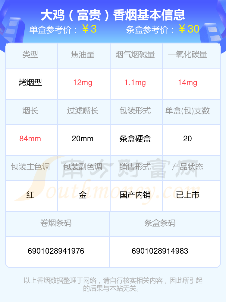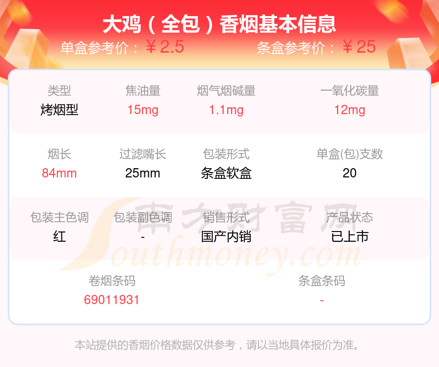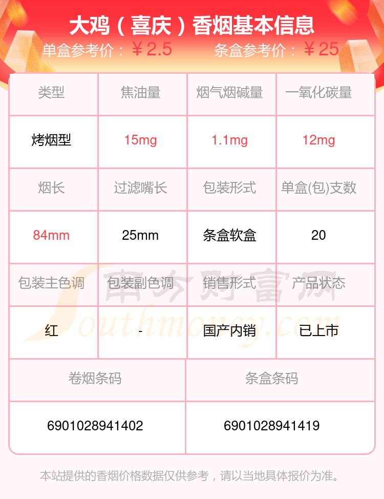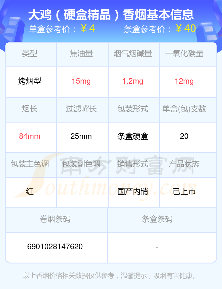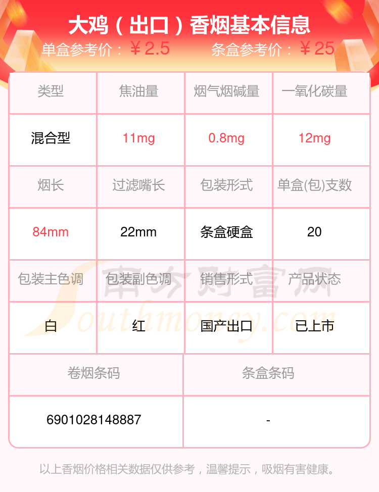 大雞香煙焦油量8mg-15mg的煙有大雞(喜慶)、大雞(全包)、大雞(硬盒精品)、大雞(富貴)、大雞(出口)等,具體價格如下: