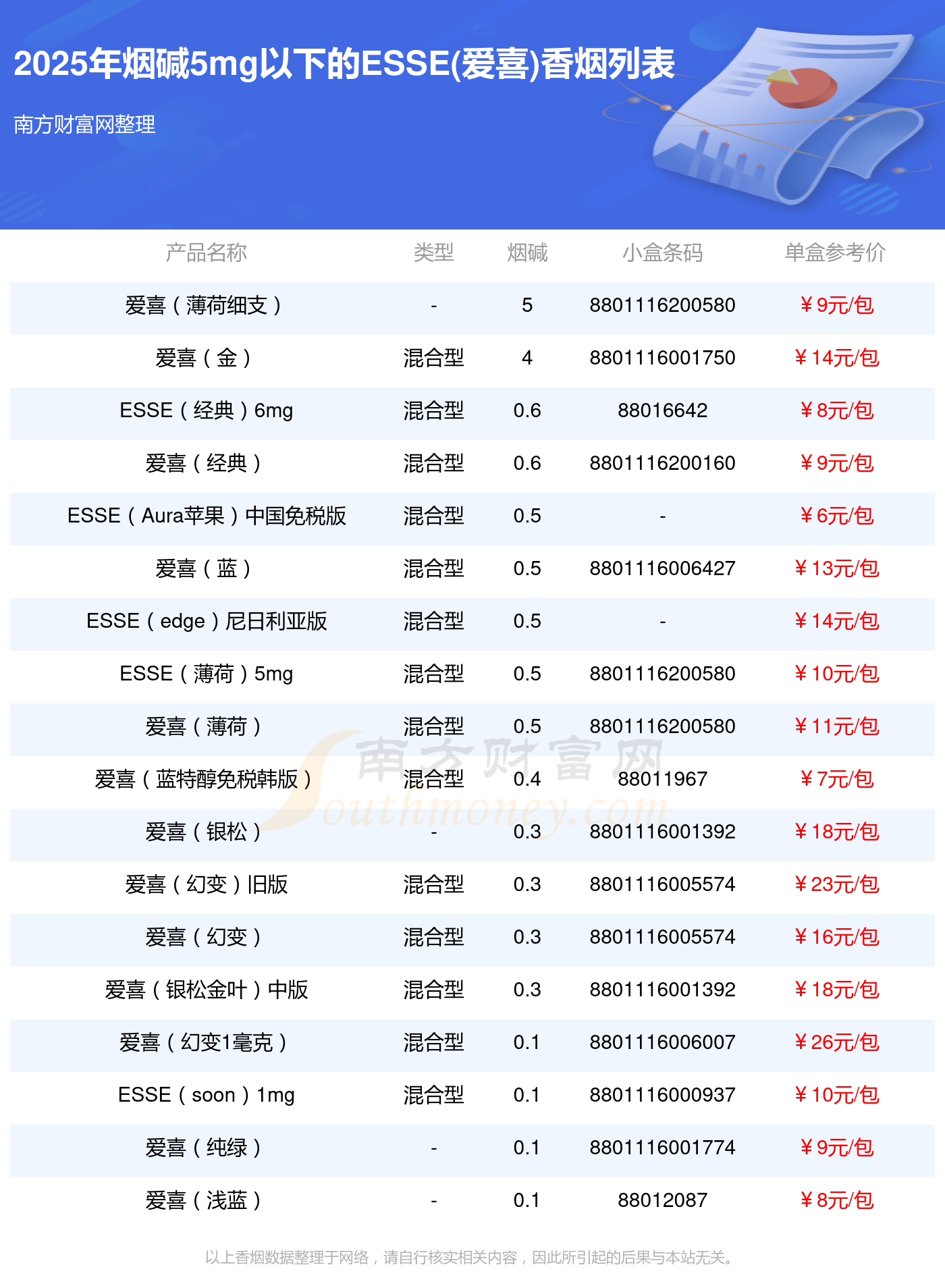 擇煙網(wǎng)為大家盤點了煙堿5mg以下的ESSE(愛喜)香煙,有愛喜(薄荷細支)、愛喜(金)、ESSE(經(jīng)典)6mg、愛喜(經(jīng)典)、ESSE(Aura蘋果)中國免稅版、愛喜(藍)、ESSE(edge)尼日利亞版、ESSE(薄荷)5mg、愛喜(薄荷)、愛喜(藍特醇免稅韓版)等,詳細價格如下: