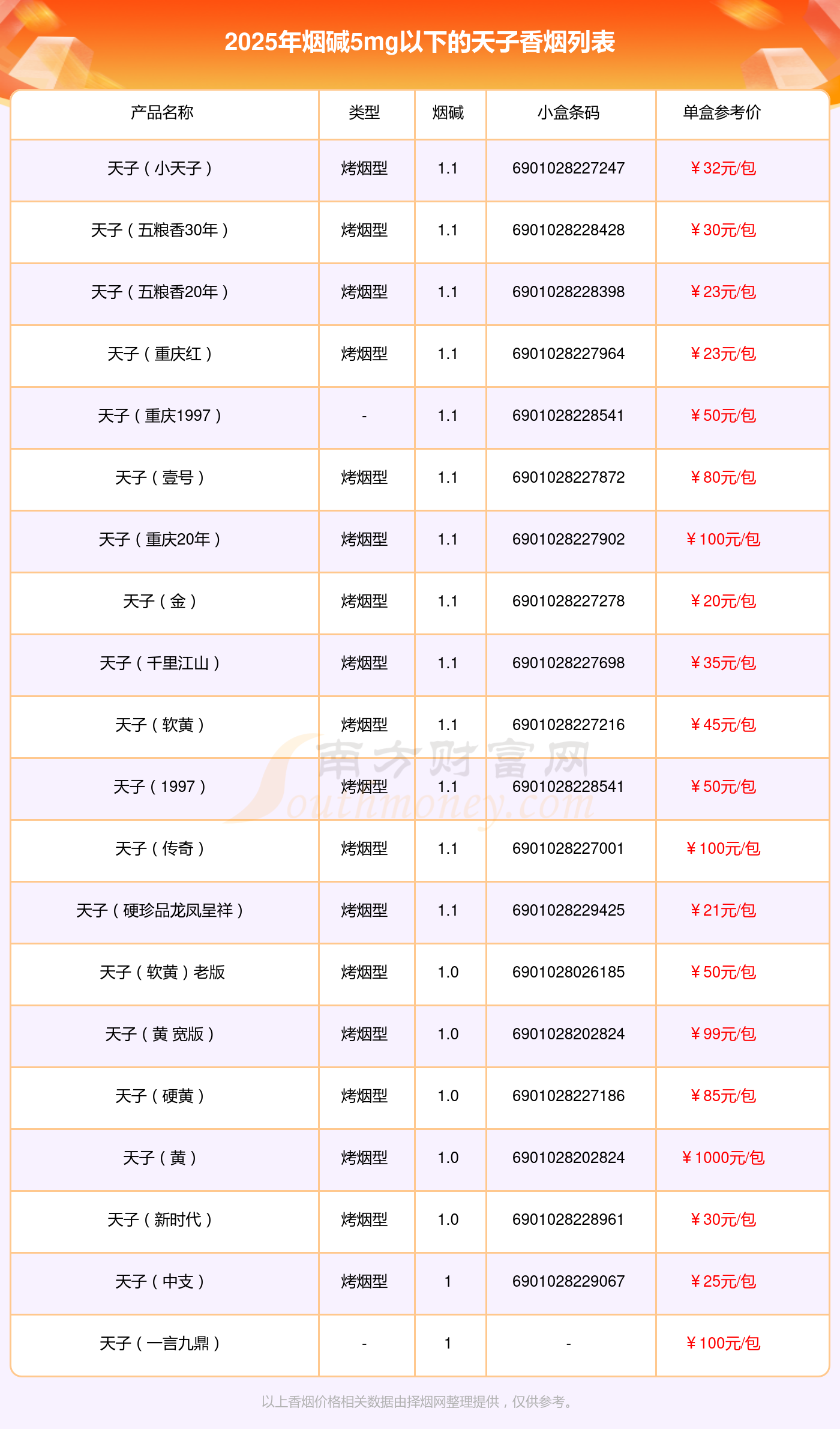 煙堿5mg以下的天子香煙有哪些?擇煙網(wǎng)為大家整理盤點,分別有: