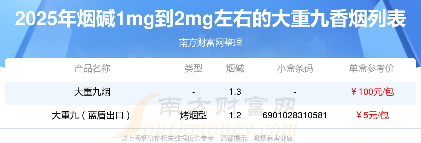 大重九香煙煙堿1mg到2mg左右的煙有大重九煙、大重九(藍(lán)盾出口)等,具體價(jià)格如下: