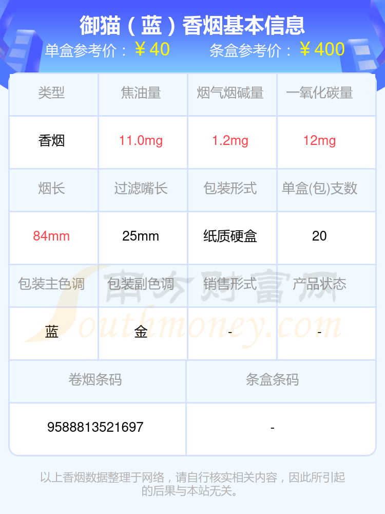 中商煙草集團(tuán)有限公司(澳門)出品的“御貓”金,藍(lán)兩款卷煙,于2008年起,作為國(guó)內(nèi)高檔烤煙型進(jìn)口卷煙,首先進(jìn)入北京,浙江,深圳等地卷煙市場(chǎng)!坝垺本頍熕脽熑~,是從世界各地一百多種名貴烤煙煙葉中精心挑選出十六只品質(zhì)卓越的上等煙葉組成。
