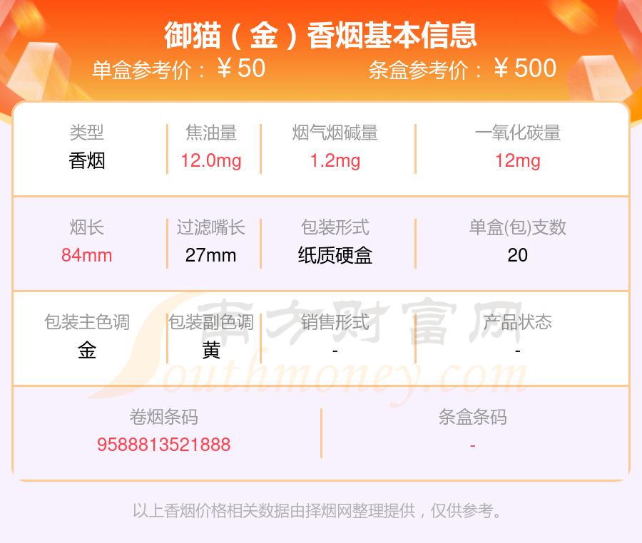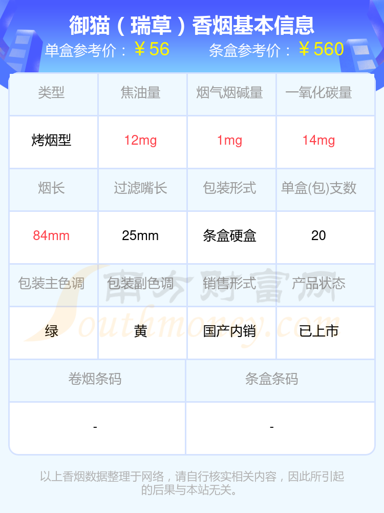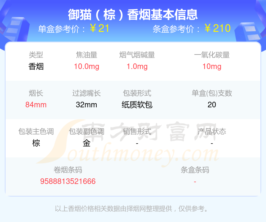 擇煙網(wǎng)為大家盤點(diǎn)了御貓香煙煙堿5mg以下的,分別有御貓(藍(lán))、御貓(金)、御貓(棕)、御貓(瑞草)、御貓(融和細(xì)支)、御貓(融和)、御貓(王道)等,具體價(jià)格如下: