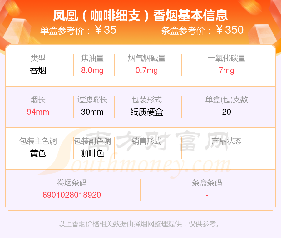 鳳凰香煙煙堿量低于1mg的煙有鳳凰(咖啡細支)、鳳凰(細支)等,詳細價格如下: