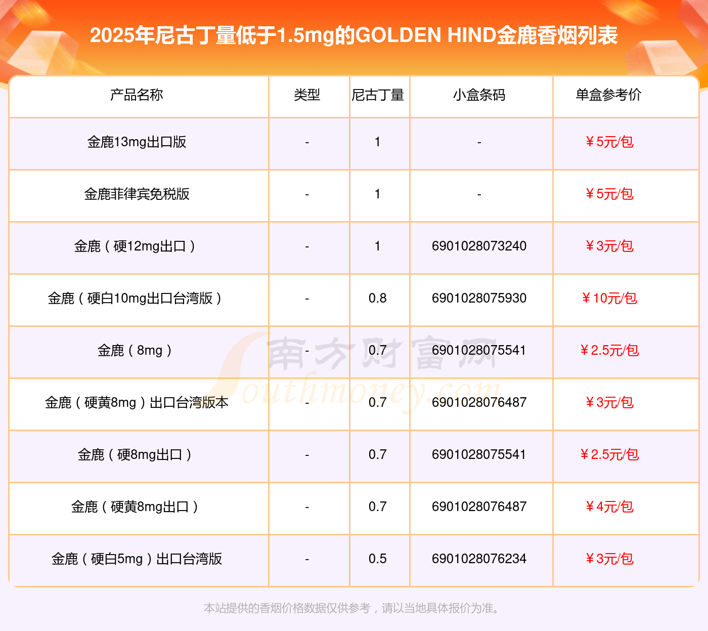 金鹿13mg出口版參考價(jià)5元/包、金鹿菲律賓免稅版參考價(jià)5元/包、金鹿(硬12mg出口)參考價(jià)3元/包、金鹿(硬白10mg出口臺(tái)灣版)參考價(jià)10元/包、金鹿(8mg)參考價(jià)2.5元/包、金鹿(硬黃8mg)出口臺(tái)灣版本參考價(jià)3元/包、金鹿(硬8mg出口)參考價(jià)2.5元/包、金鹿(硬黃8mg出口)參考價(jià)4元/包、金鹿(硬白5mg)出口臺(tái)灣版參考價(jià)3元/包等。