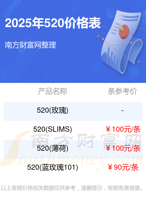 2025年,520(薄荷)、520(SLIMS)、520(藍(lán)玫瑰101)等520香煙價(jià)格如下:520(薄荷)參考價(jià)100.0元/條、520(SLIMS)參考價(jià)100.0元/條、520(藍(lán)玫瑰101)參考價(jià)90.0元/條。