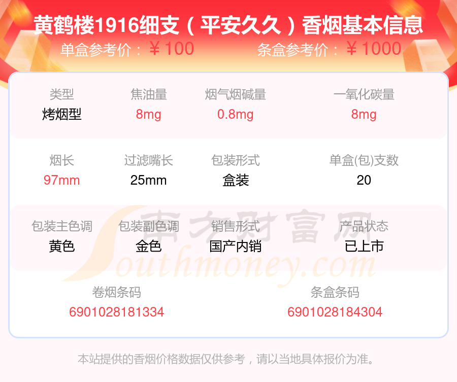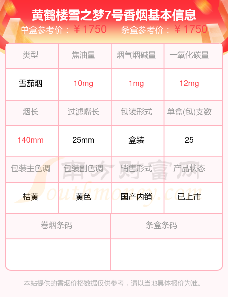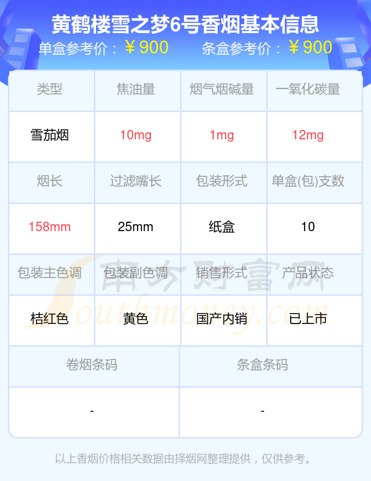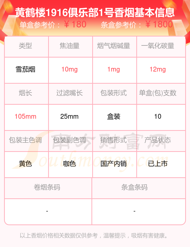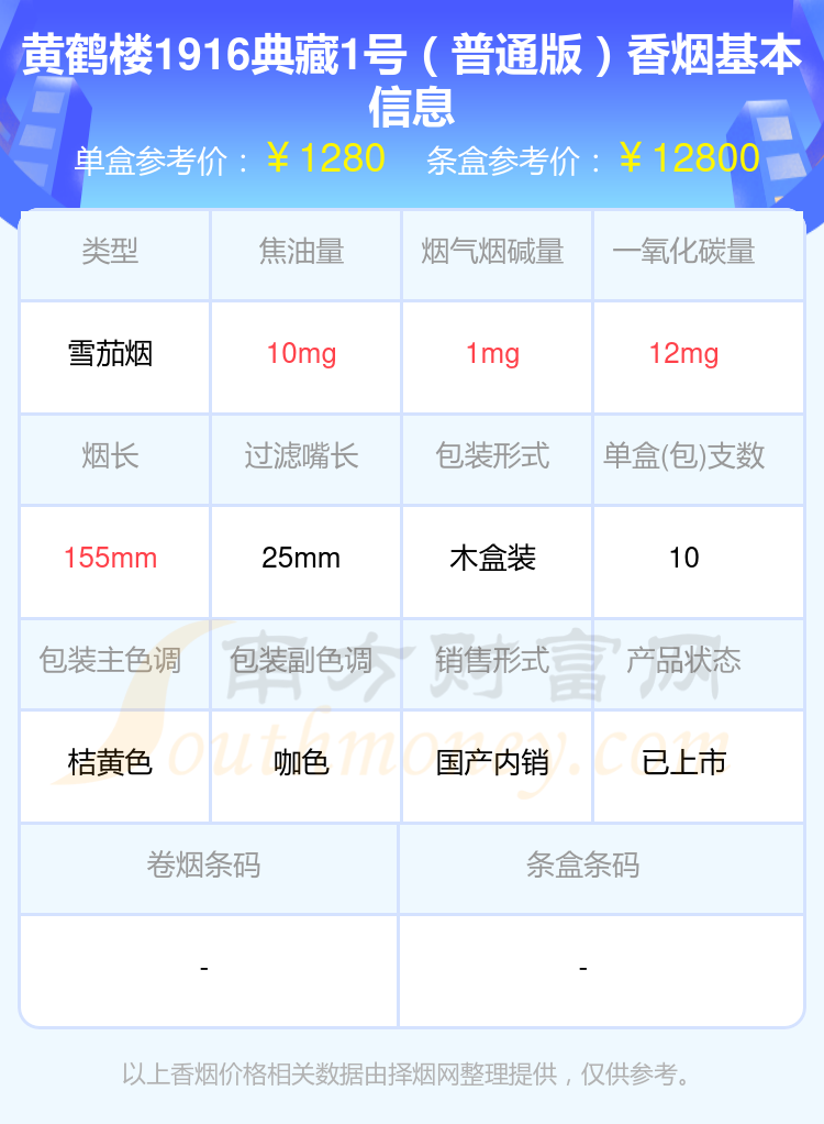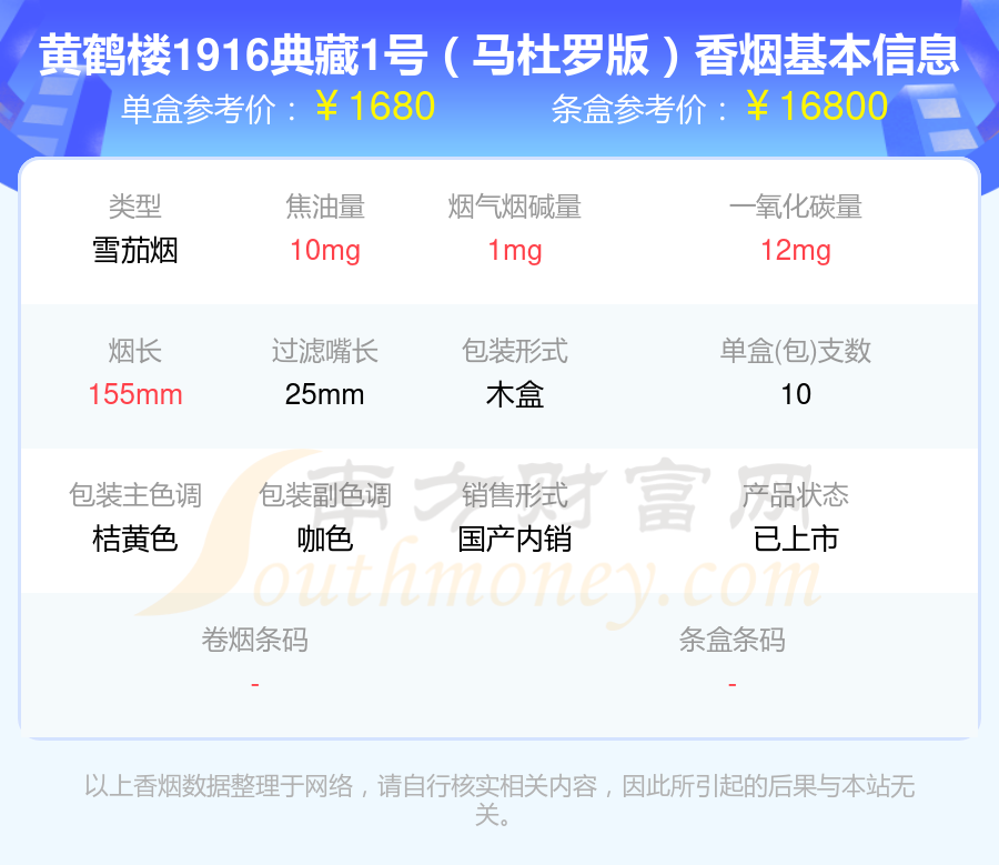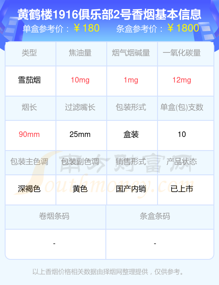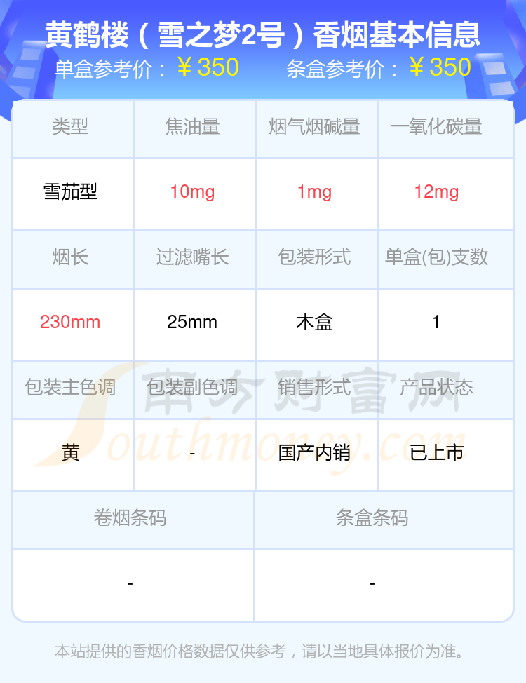 黃鶴樓雪之夢(mèng)6號(hào)參考價(jià)900元/包、黃鶴樓(雪之夢(mèng)2號(hào))參考價(jià)350元/包、黃鶴樓1916俱樂(lè)部2號(hào)參考價(jià)180元/包、黃鶴樓1916俱樂(lè)部1號(hào)參考價(jià)180元/包、黃鶴樓雪之夢(mèng)7號(hào)參考價(jià)1750元/包、黃鶴樓1916典藏1號(hào)(馬杜羅版)參考價(jià)1680元/包、黃鶴樓1916典藏1號(hào)(普通版)參考價(jià)1280元/包、黃鶴樓1916細(xì)支(平安久久)參考價(jià)100元/包等。