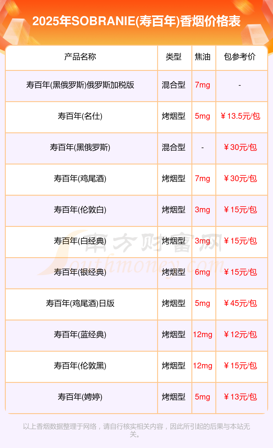 2025年SOBRANIE(壽百年)香煙壽百年(雞尾酒)日版、壽百年(雞尾酒)、壽百年(倫敦白)、壽百年(銀經(jīng)典)等最新價(jià)格如下: