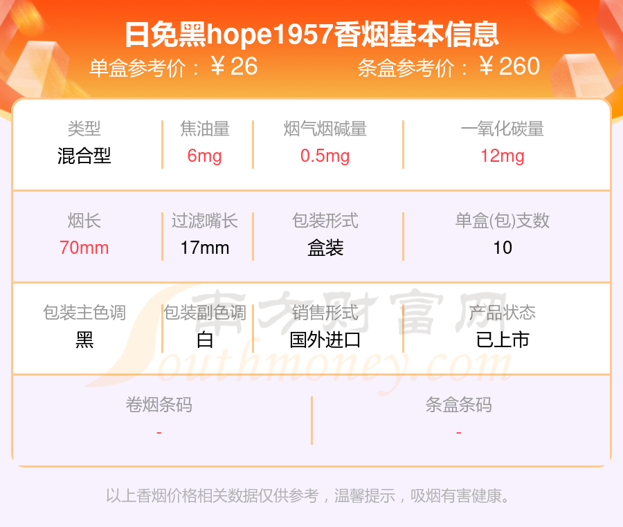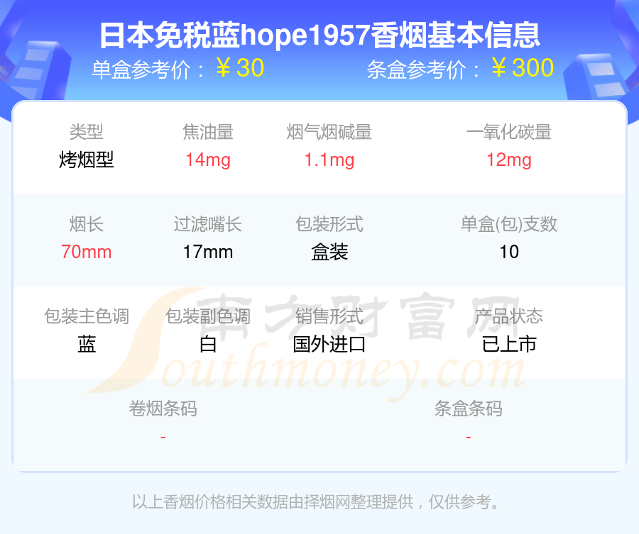 二十至四十元左右的HOPE香煙有哪些?擇煙網(wǎng)為大家整理盤點(diǎn),分別有:日本免稅藍(lán)hope1957、日免黑hope1957、HOPE(藍(lán))10支裝日本免稅出口版等,具體價(jià)格如下:
