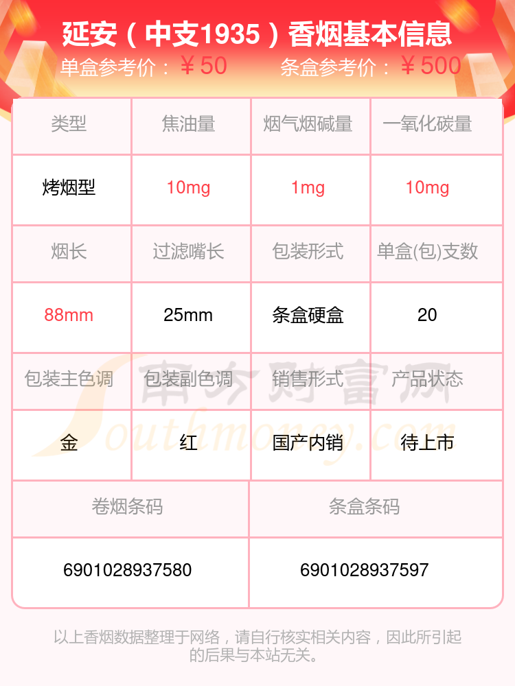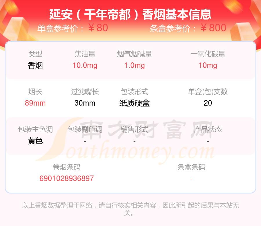 擇煙網(wǎng)為大家盤點了50元-80元左右的延安香煙,分別有延安(千年帝都)、延安(千年帝都中支)、延安(細支1935)、延安(1935)、延安(中支1935)、延安(1935中支)等,具體價格如下: