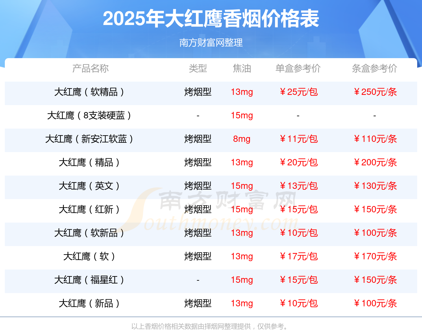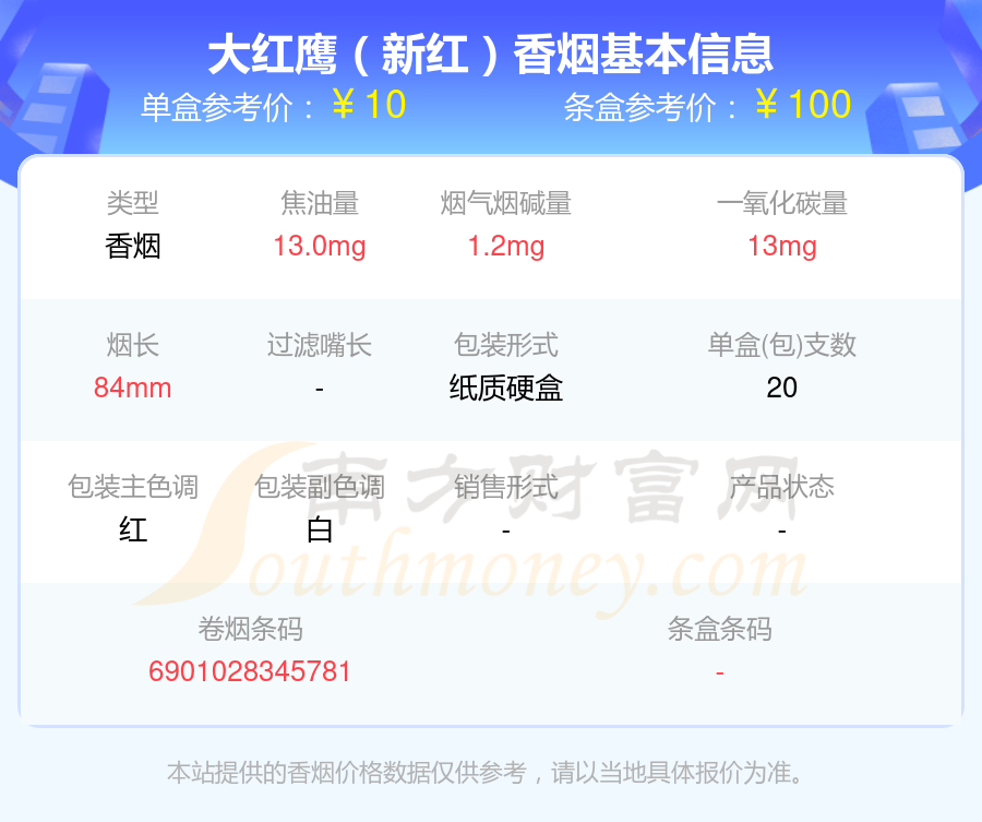 大紅鷹(新紅)香煙網(wǎng)友評分:口味評分6.2分,外觀評分5.9分,性價比評分3.8分,綜合得分5.3分。