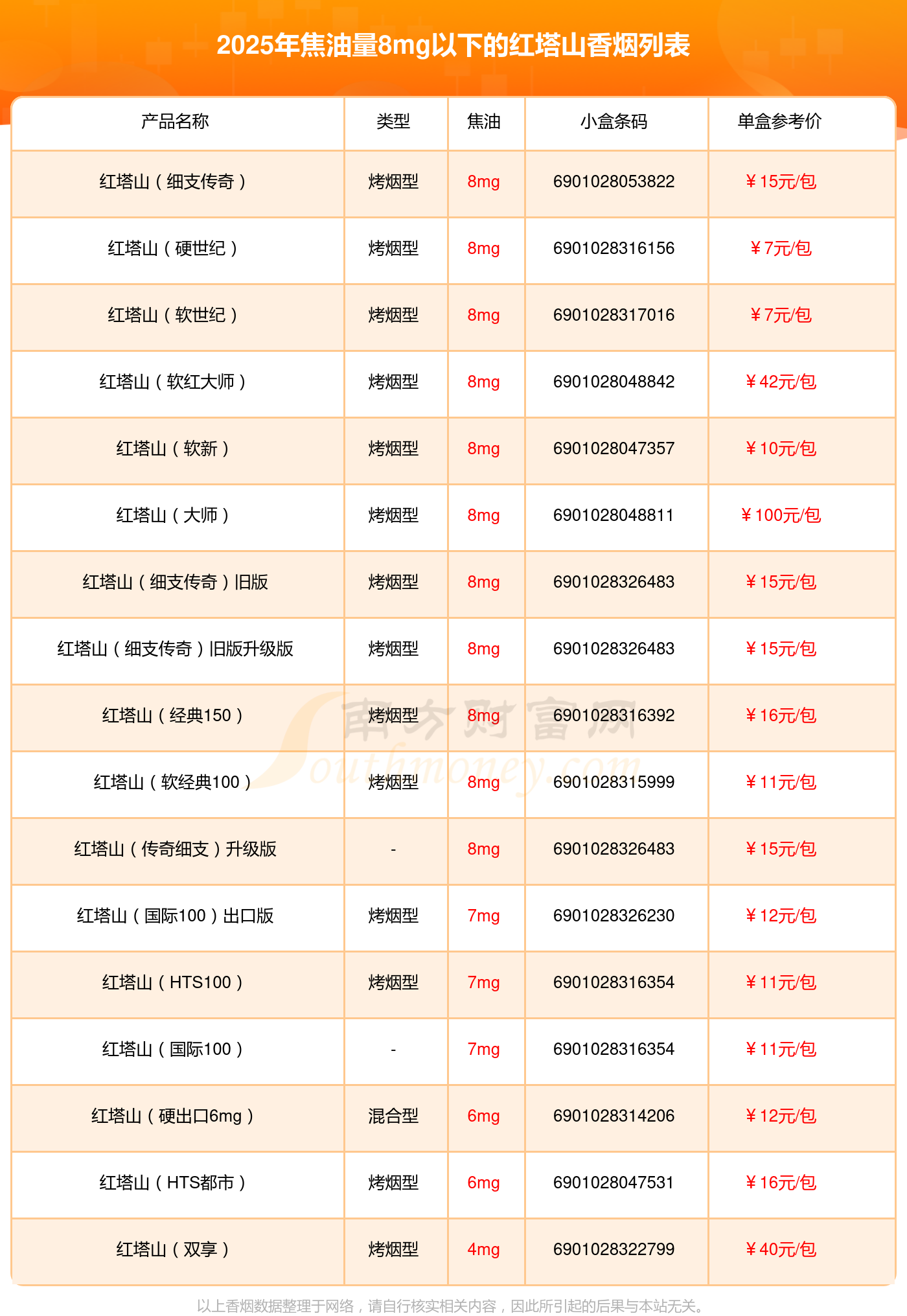 紅塔山(細(xì)支傳奇)參考價(jià)15.0元/包、紅塔山(硬世紀(jì))參考價(jià)7.0元/包、紅塔山(軟世紀(jì))參考價(jià)7.0元/包、紅塔山(軟紅大師)參考價(jià)42.0元/包、紅塔山(軟新)參考價(jià)10.0元/包、紅塔山(大師)參考價(jià)100.0元/包、紅塔山(細(xì)支傳奇)舊版參考價(jià)15.0元/包、紅塔山(細(xì)支傳奇)舊版升級(jí)版參考價(jià)15.0元/包、紅塔山(經(jīng)典150)參考價(jià)16.0元/包、紅塔山(軟經(jīng)典100)參考價(jià)11.0元/包等。