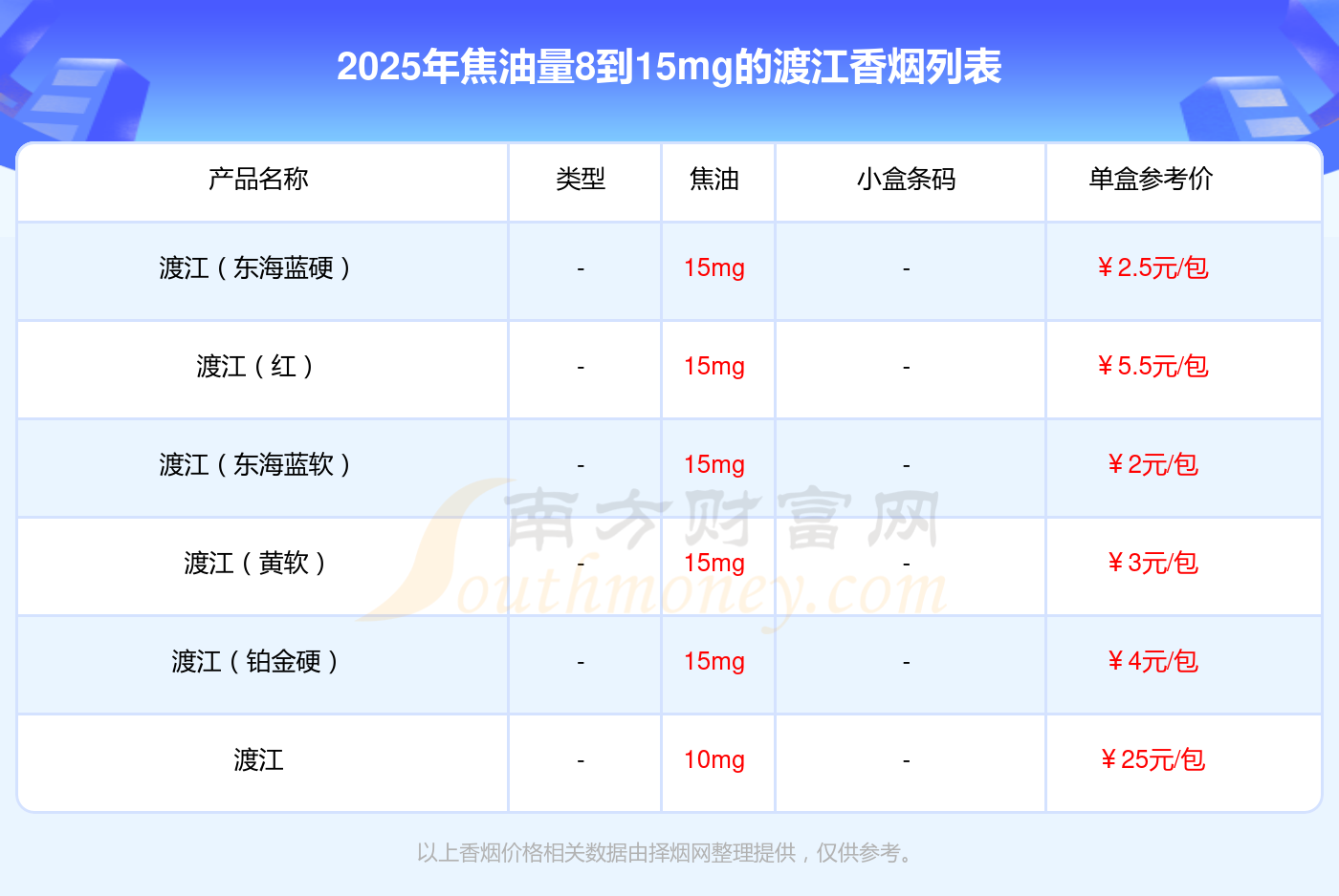 焦油量8到15mg的渡江香煙有哪些?擇煙網(wǎng)為大家整理盤點,有渡江(東海藍硬)、渡江(紅)、渡江(東海藍軟)、渡江(黃軟)、渡江(鉑金硬)、渡江等,詳細價格如下: