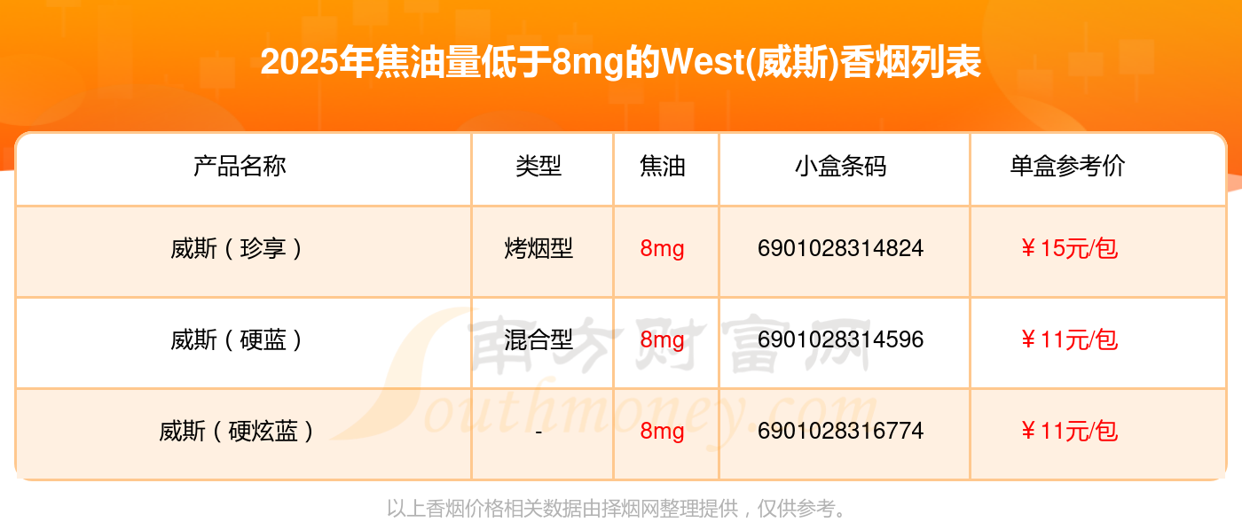 擇煙網(wǎng)為大家盤點了West(威斯)香煙焦油量低于8mg的,分別有威斯(珍享)、威斯(硬藍)、威斯(硬炫藍)等,具體價格如下:
