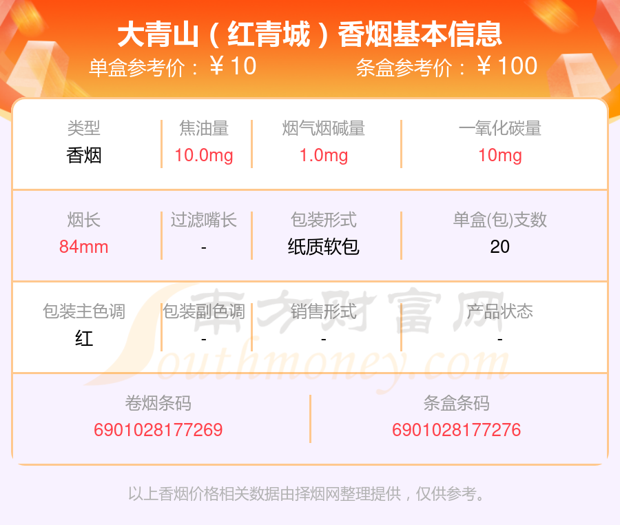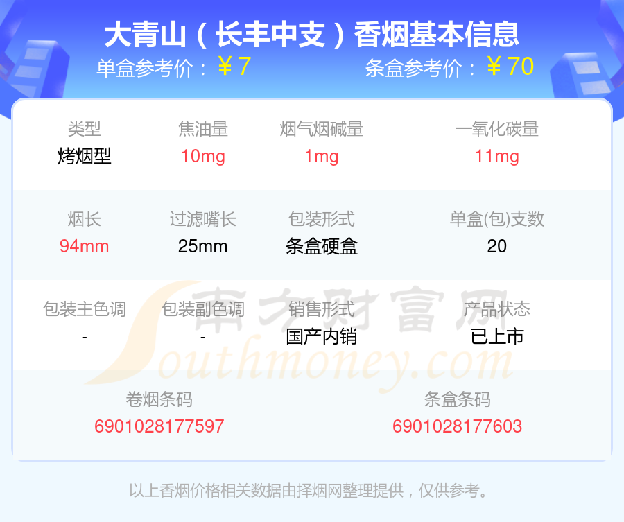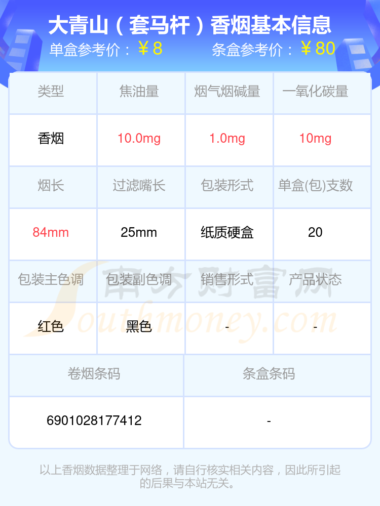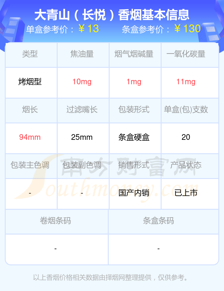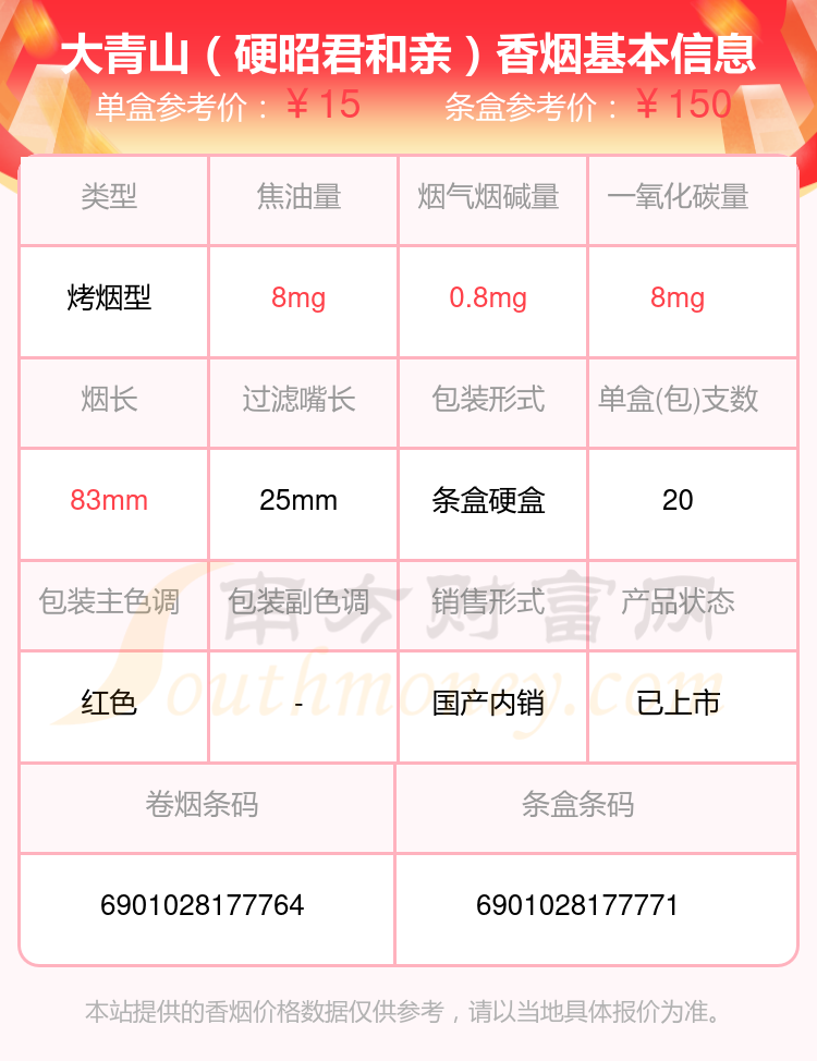 大青山(狼圖騰)參考價(jià)22.0元/包、大青山(硬昭君和親)參考價(jià)15元/包、大青山(軟)參考價(jià)2.5元/包、大青山(紅)參考價(jià)2.5元/包、大青山(紅青城)參考價(jià)10.0元/包、大青山(青城)參考價(jià)10.0元/包、大青山(套馬桿)參考價(jià)8.0元/包、大青山(長(zhǎng)悅)參考價(jià)13元/包、大青山(長(zhǎng)豐)參考價(jià)7元/包、大青山(長(zhǎng)豐中支)參考價(jià)7元/包等。