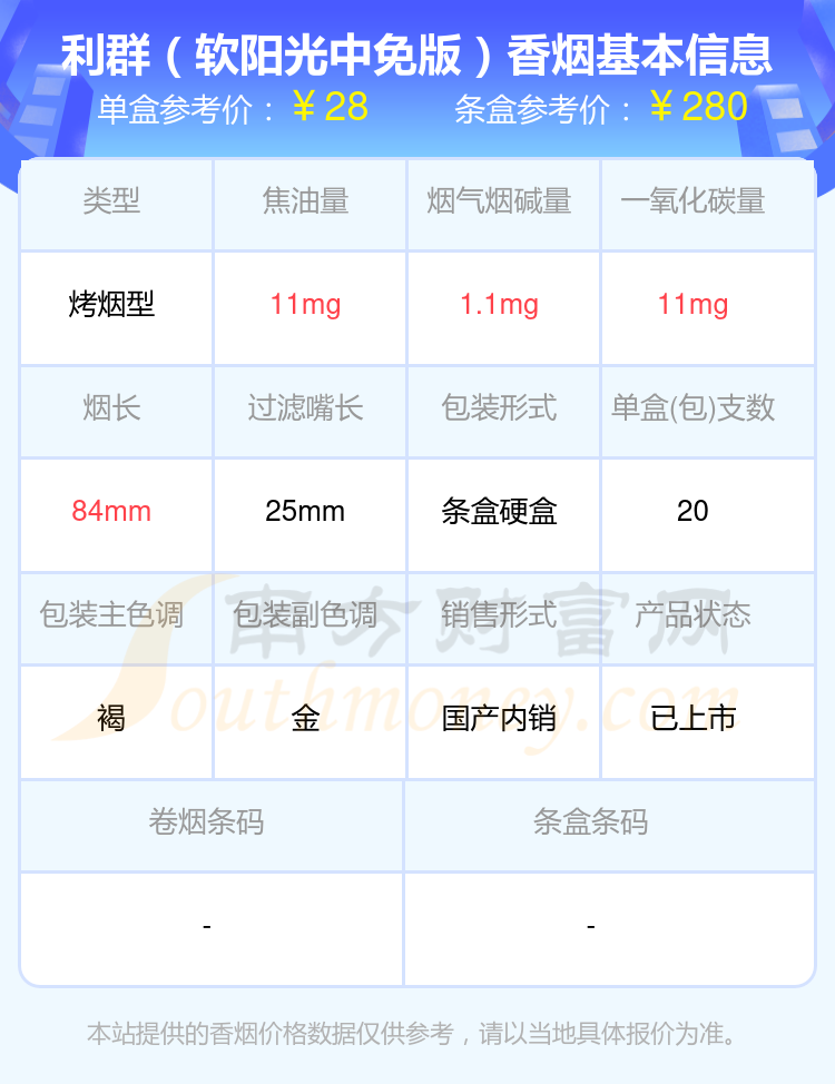 利群(軟陽(yáng)光中免版)單盒參考價(jià):28元