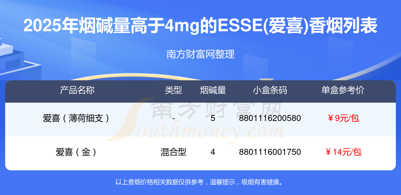 擇煙網(wǎng)為大家盤(pán)點(diǎn)了ESSE(愛(ài)喜)香煙煙堿量高于4mg的,分別有愛(ài)喜(薄荷細(xì)支)、愛(ài)喜(金)等,詳細(xì)價(jià)格如下: