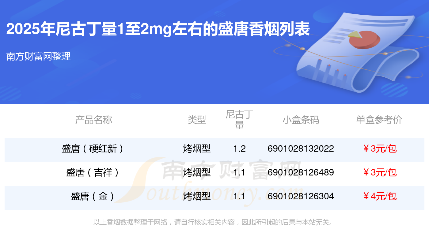 擇煙網為大家盤點了尼古丁量1至2mg左右的盛唐香煙,有以下這些:
