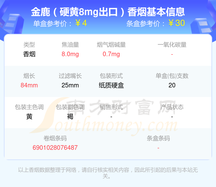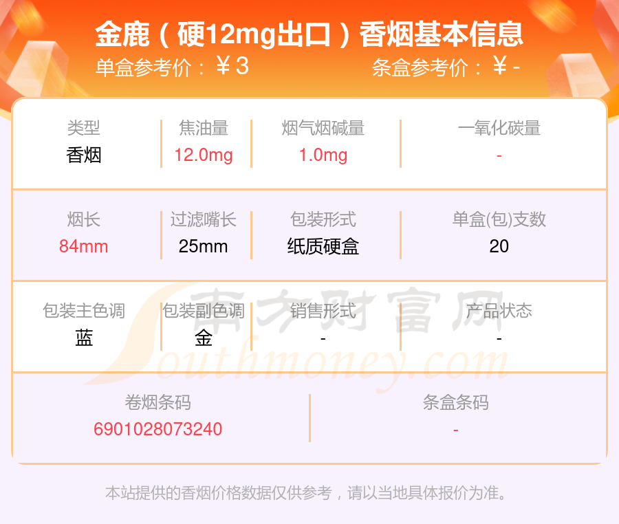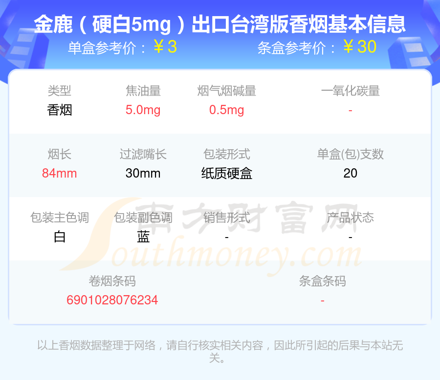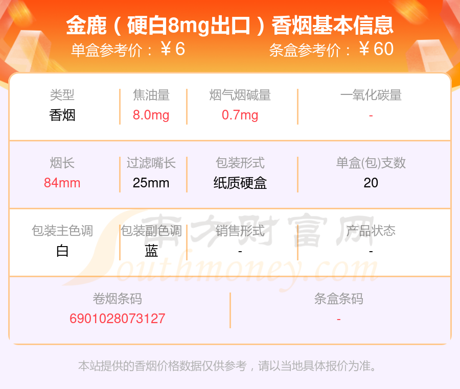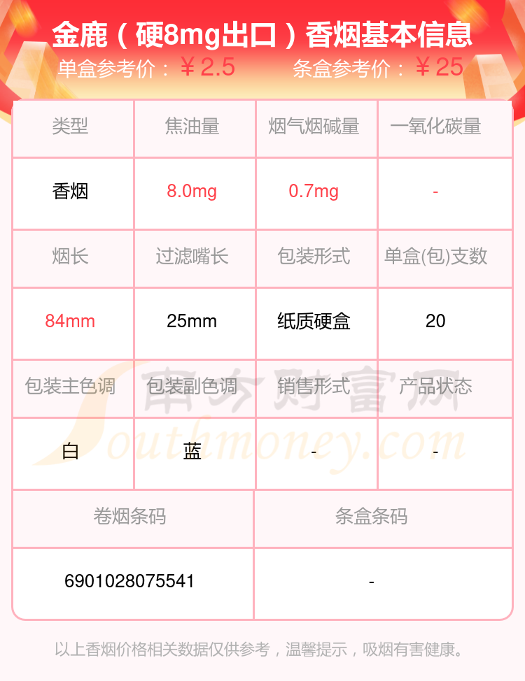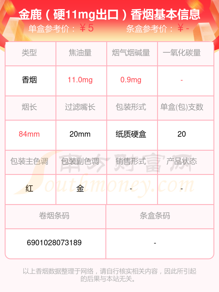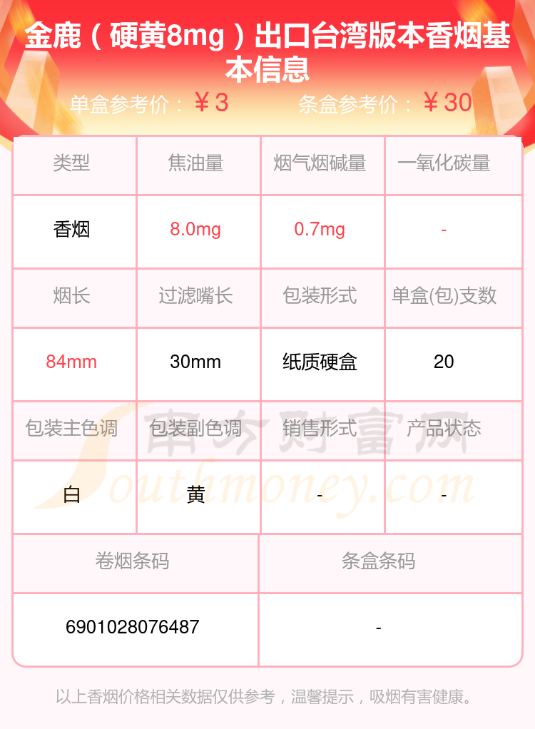 金鹿(硬12mg出口)參考價(jià)3.0元/包、金鹿(硬11mg出口)參考價(jià)5.0元/包、金鹿(硬10mg出口)參考價(jià)4元/包、金鹿(硬白8mg出口)參考價(jià)6.0元/包、金鹿(硬8mg出口)參考價(jià)2.5元/包、金鹿(硬黃8mg)出口臺(tái)灣版本參考價(jià)3.0元/包、金鹿(8mg)參考價(jià)3元/包、金鹿(硬黃8mg出口)參考價(jià)4.0元/包、金鹿(硬白5mg)出口臺(tái)灣版參考價(jià)3.0元/包、金鹿(硬5mg出口)參考價(jià)2.5元/包等。