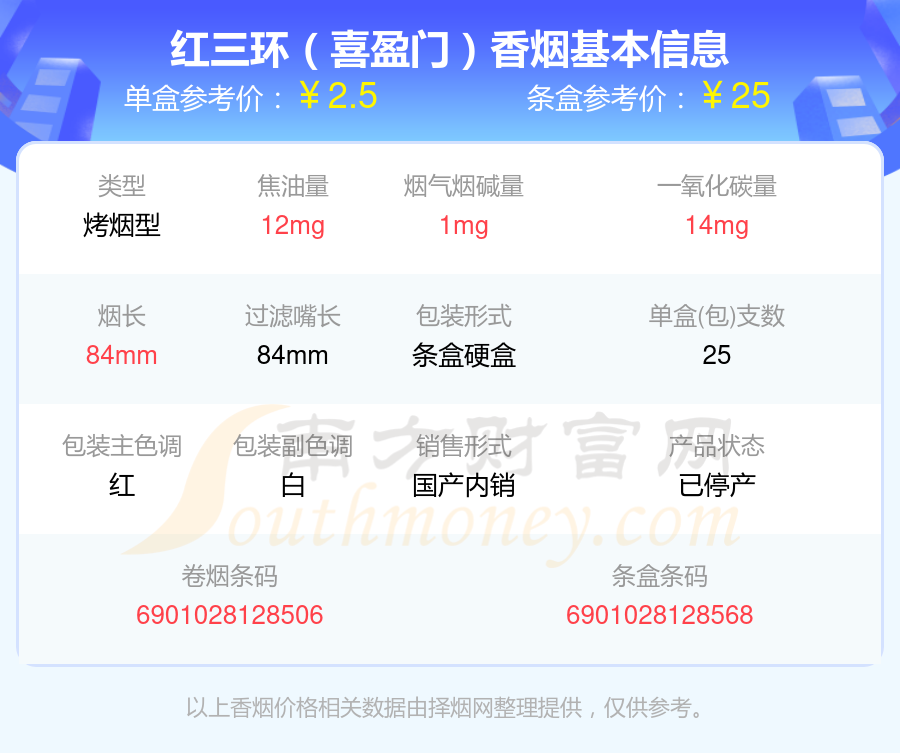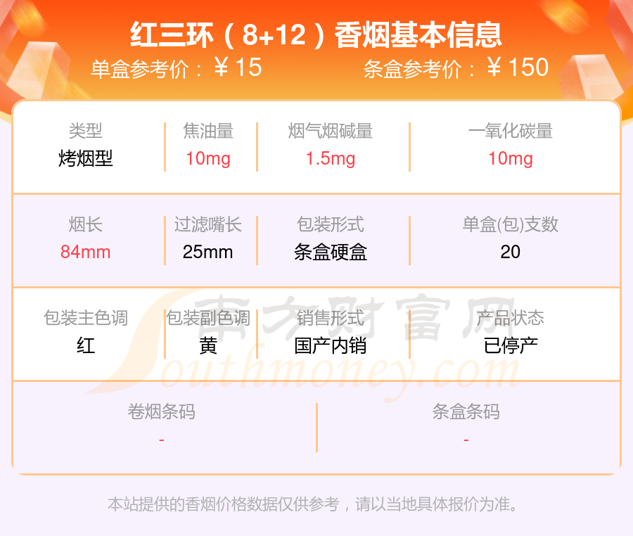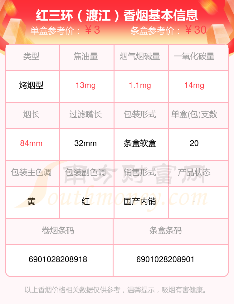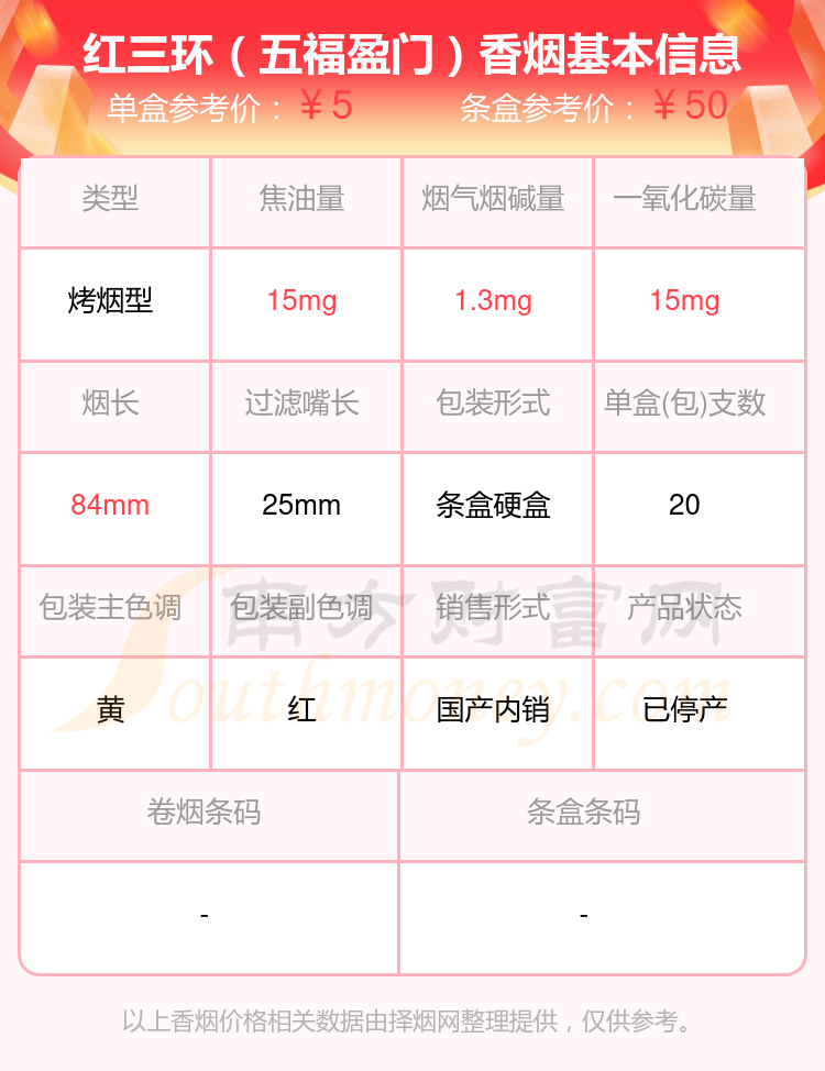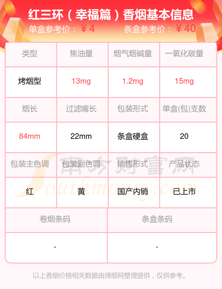 紅三環(huán)(8+12)參考價15元/包、紅三環(huán)(五福盈門)參考價5元/包、紅三環(huán)(紅)參考價5元/包、紅三環(huán)(幸福篇)參考價4元/包、紅三環(huán)(渡江)參考價3元/包、紅三環(huán)(喜盈門)參考價2.5元/包等。