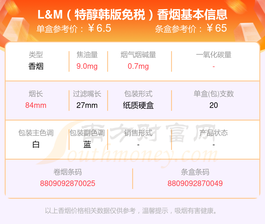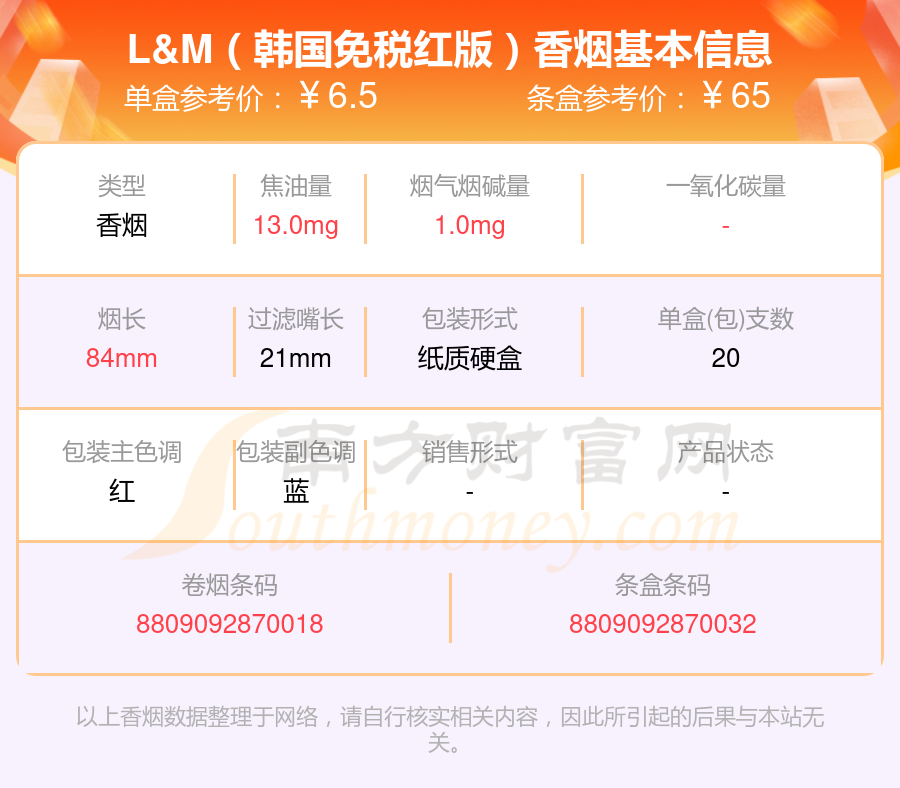 L&M香煙煙堿量1mg以下的煙有哪些?擇煙網(wǎng)為大家整理提供,分別有:L&M(韓國免稅紅版)、L&M(南非免稅紅版)、L&M(特醇韓版免稅)、L&M(南非免稅藍(lán)版)等,具體價(jià)格如下: