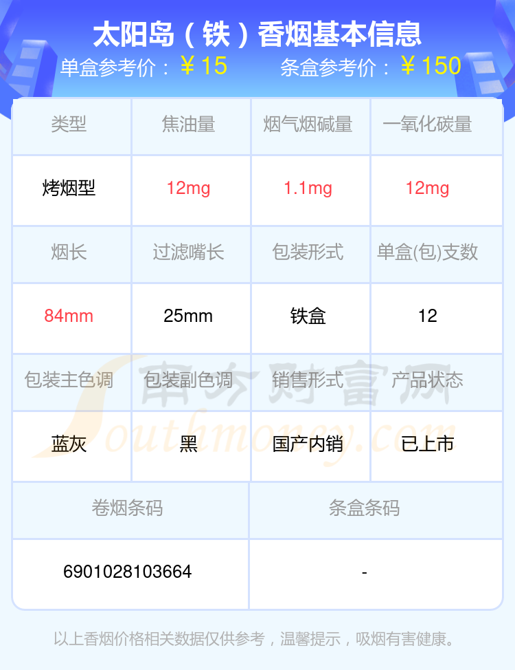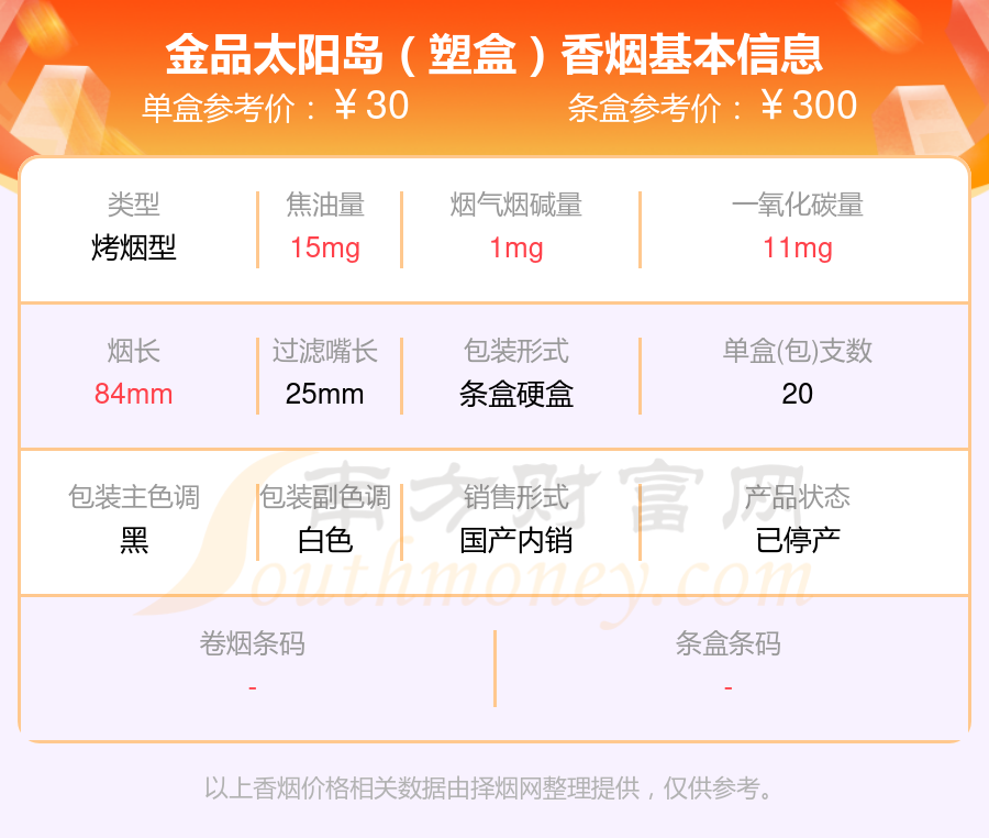 太陽(yáng)島香煙尼古丁量5mg以下的煙分別有太陽(yáng)島(鐵)參考價(jià)15元/包、金品太陽(yáng)島(塑盒)參考價(jià)30元/包等。